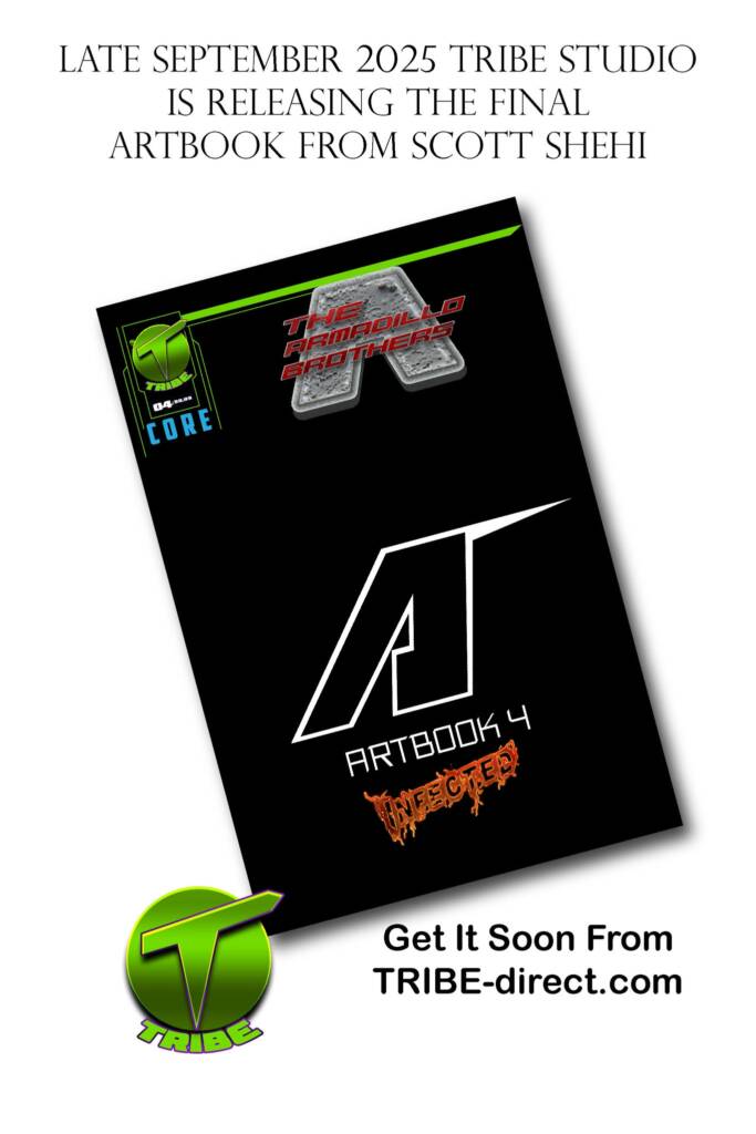 The 2025 Armadillo Bros artbook is complete and coming your way soon! In just one week you can pick up the Armadillo Bros INFECTED art book. The massive art book re-imagines the Armadillo Bros with the new theme, all of them being infected. Each page is filled with gruesome art to showcase the bros falling apart right on the page.